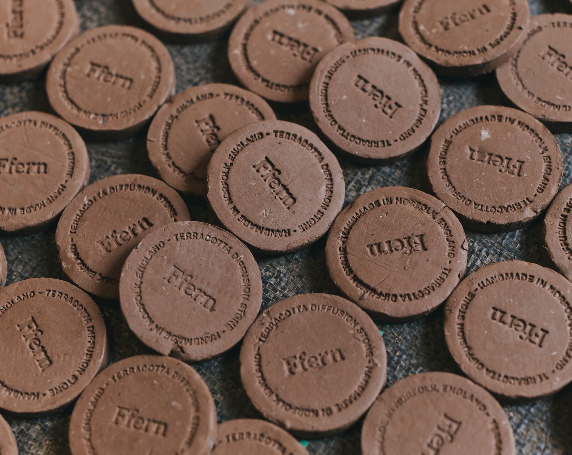 "The clay diffusers begin life as a thin flat sheet of pressed clay. The circles are individually cut, have the edges cleaned and then are individually stamped."